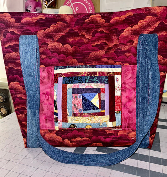 A large tote bag with reclaimed denim and/or reclaimed quilt pieces